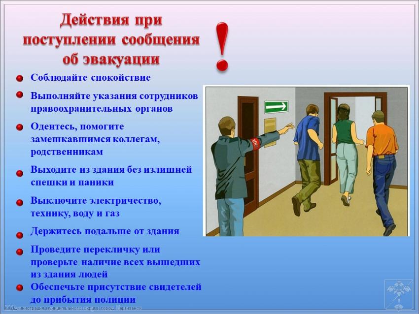 Порядок действий при проведения мероприятий по эвакуации людей из помещений при чрезвычайной ситуации, вызванной терактом. 07.02.2024Г. | Администрация муниципального округа город Партизанск Приморского края