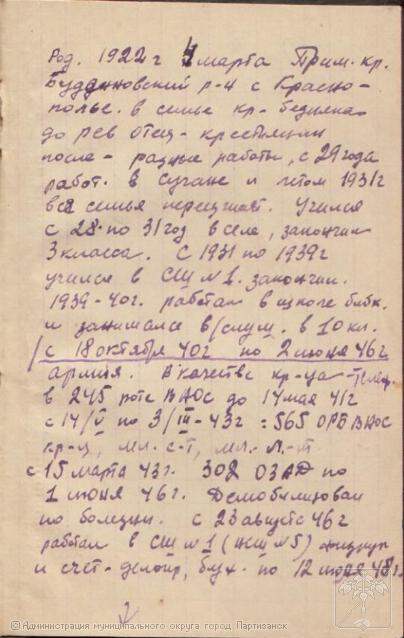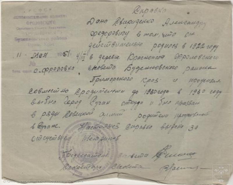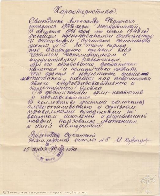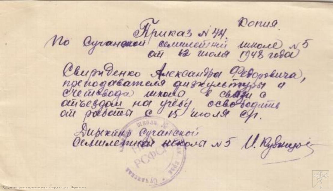 Мои родные жили в Приморье со времен Столыпинской реформы (выходцы с Украины) - прадед, так точно. В Партизанске похоронены мои дедушка и бабушка по линии отца. Мой отец Свириденко Александр Федорович родился в Сучане в 1922 году. Учился в школе № 1, которая между 1940 и 1946 годами была перенумерована и стала школой № 5 (Есть три выпускные фотографии с учителями, директором, выпускниками). Даже какое-то время после школы работал библиотекарем и преподавателем фикультуры в школе № 5. Служил во время войны на Дальнем Востоке в звании лейтенанта в войсках связи, обеспечивавших противовоздушные силы. В 1947 году переехал с семьей в Самарканд, впоследствии стал научным работником в области геологии (кандидат геолого-минералогических наук). Умер в 1988 году.