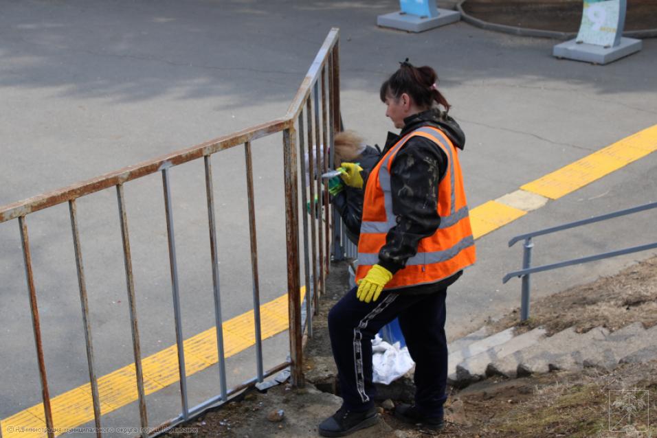 Сегодня силами МБУ «Городское хозяйство» начались работы на входной группе в городской парк – ее очистят и покрасят.