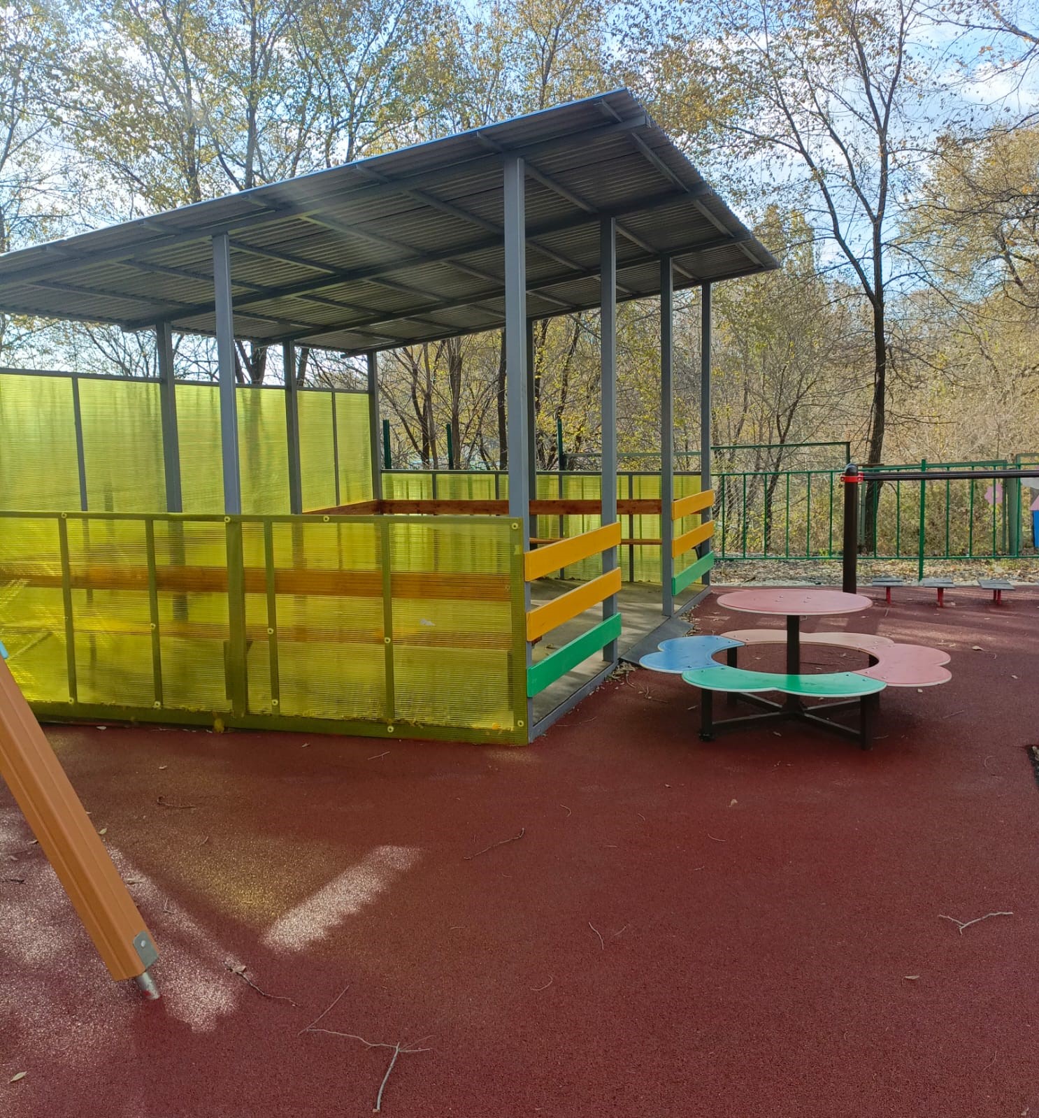 Здесь были установлены игровые и развивающие элементы, теневой навес,  ограждение с калиткой, проведены работы по укладке безопасного покрытия.